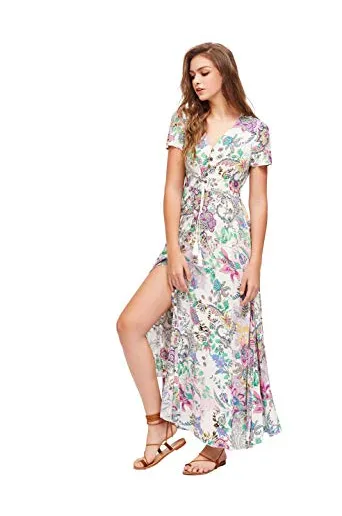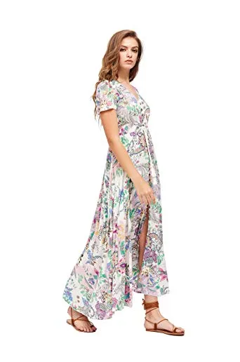 - A Line Buttons Up Flowy Split V-Neck, Short Sleeve,Floral Print,Maxi,Boho