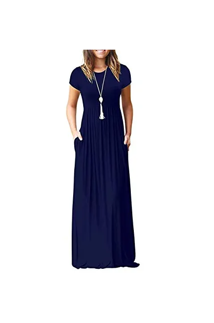 - Features: Casual Style,Two Side Pockets,Short Sleeves,Round Neck,Floor Length,Elastic at Waist,Not lined,Maxi Dresses