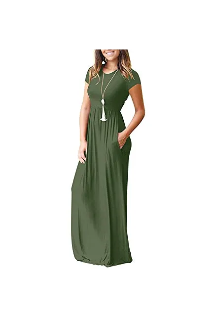 - Features: Casual Style,Two Side Pockets,Short Sleeves,Round Neck,Floor Length,Elastic at Waist,Not lined,Maxi Dresses