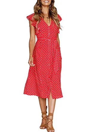 - Style: Sexy, V-neckline, Button down front, Adjustable tie waist, Flutter sleeves, Two side pockets, Midi length