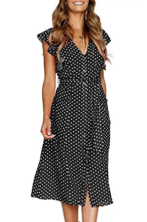 - Style: Sexy, V-neckline, Button down front, Adjustable tie waist, Flutter sleeves, Two side pockets, Midi length