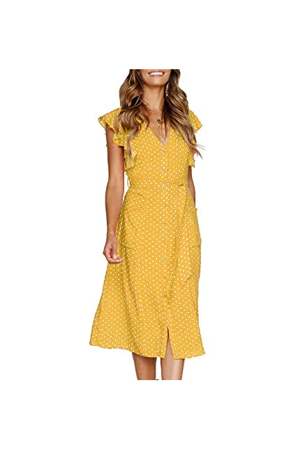 - Style: Sexy, V-neckline, Button down front, Adjustable tie waist, Flutter sleeves, Two side pockets, Midi length