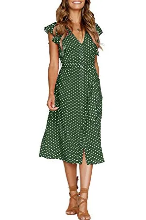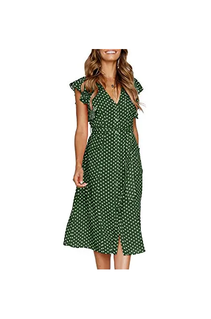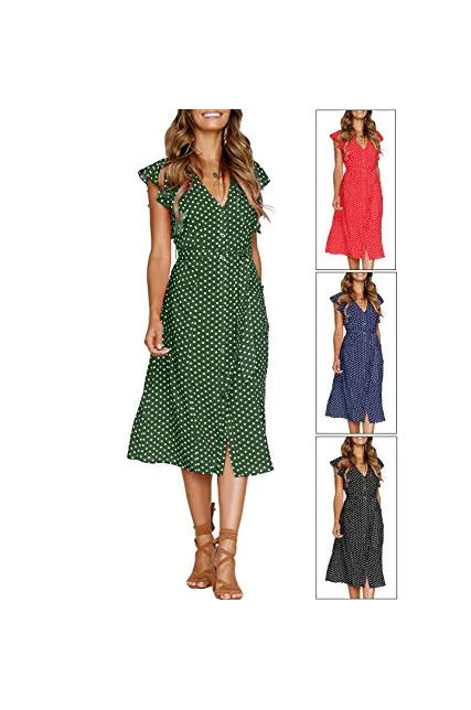 - Style: Sexy, V-neckline, Button down front, Adjustable tie waist, Flutter sleeves, Two side pockets, Midi length