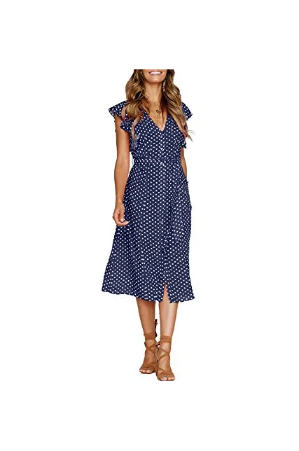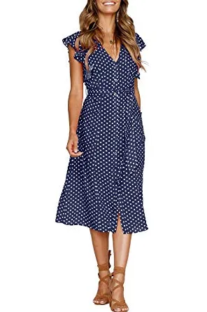 - Style: Sexy, V-neckline, Button down front, Adjustable tie waist, Flutter sleeves, Two side pockets, Midi length
