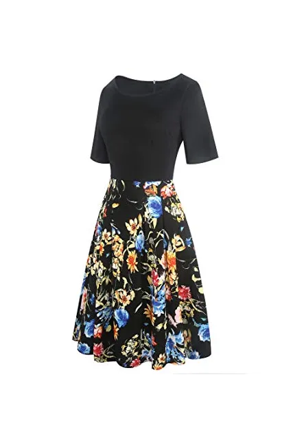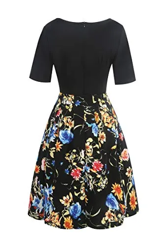 - Women's Vintage Patchwork Pockets Puffy Swing Casual Party Dress O-Neck,Ball Gown,Fit and Flare.This dress have pockets in side.
