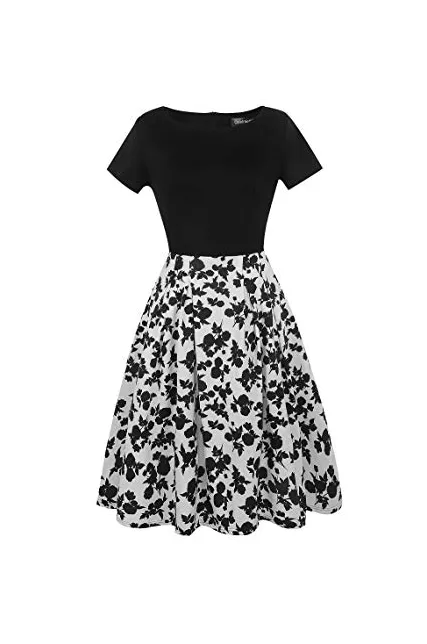 - Women's Vintage Patchwork Pockets Puffy Swing Casual Party Dress O-Neck,Ball Gown,Fit and Flare.This dress have pockets in side.