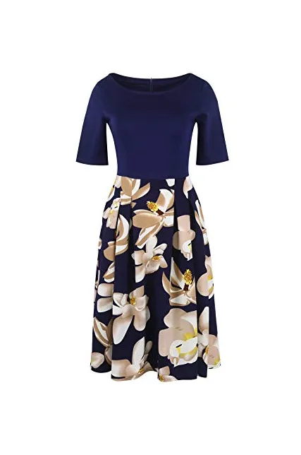 - Women's Vintage Patchwork Pockets Puffy Swing Casual Party Dress O-Neck,Ball Gown,Fit and Flare.This dress have pockets in side.