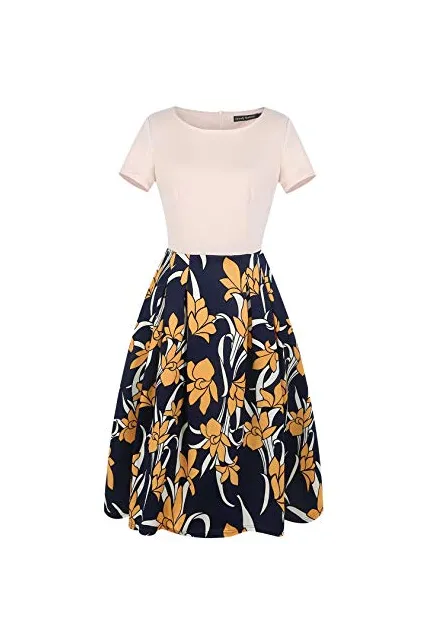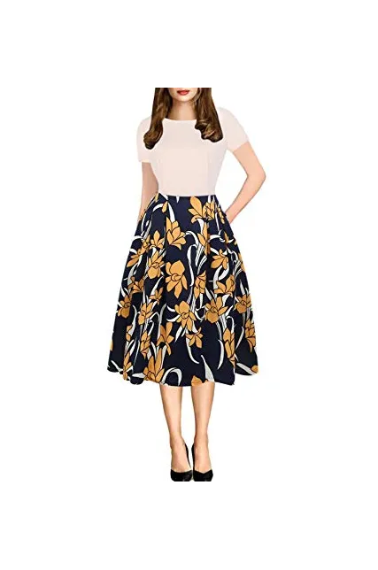 - Women's Vintage Patchwork Pockets Puffy Swing Casual Party Dress O-Neck,Ball Gown,Fit and Flare.This dress have pockets in side.