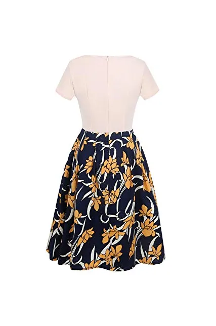 - Women's Vintage Patchwork Pockets Puffy Swing Casual Party Dress O-Neck,Ball Gown,Fit and Flare.This dress have pockets in side.