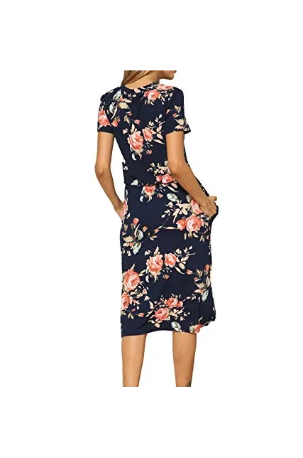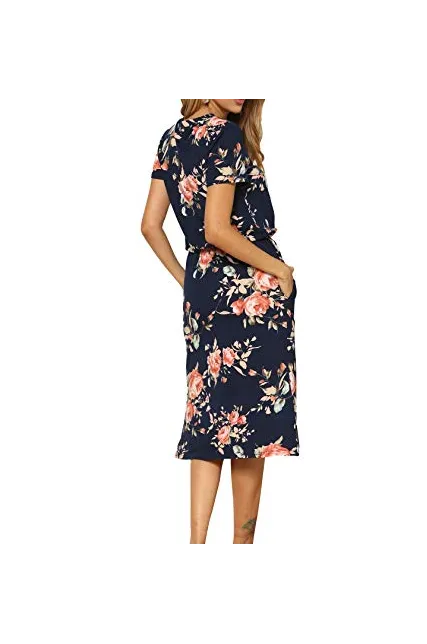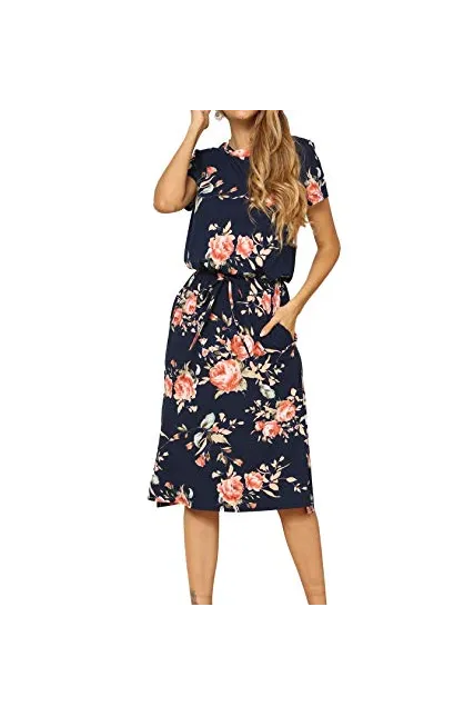 - Features:Casual Style,Two Side Pockets,Short Sleeve,Elastic Waist,Tie-Belt,Midi Dress,Floral Print,Knee Length,Side Split