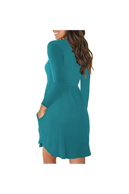 - Features: round neckline (no necklace included),long sleeve,elastic band at waist,two side-seam pockets which deep enough for a card or a lip balm,above knee length,irregular hem.