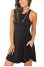 - Features: round neckline (no necklace included),racerback sleeveless,elastic band at waist,two side-seam pockets which deep enough for a card or a lip balm,above knee length,irregular hem.