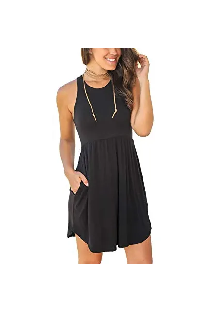 - Features: round neckline (no necklace included),racerback sleeveless,elastic band at waist,two side-seam pockets which deep enough for a card or a lip balm,above knee length,irregular hem.