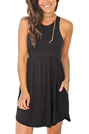 - Features: round neckline (no necklace included),racerback sleeveless,elastic band at waist,two side-seam pockets which deep enough for a card or a lip balm,above knee length,irregular hem.