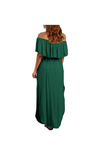 VERABENDI Women's Off Shoulder Summer Casual Long Ruffle Beach Maxi Dress with Pockets