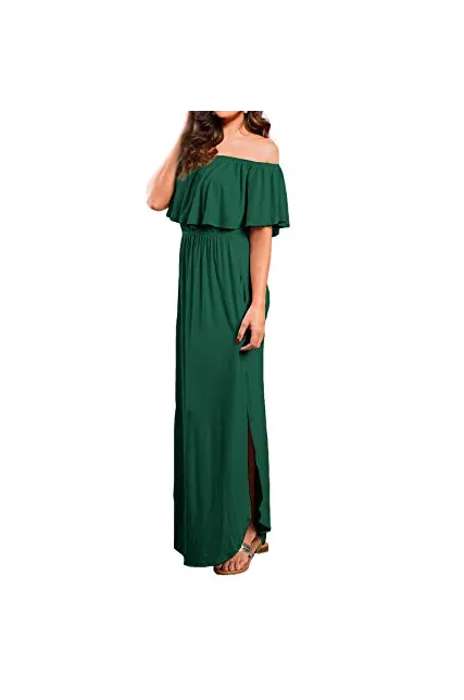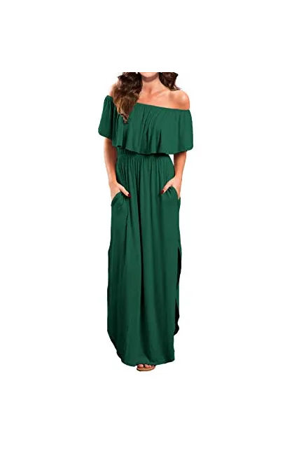 VERABENDI Women's Off Shoulder Summer Casual Long Ruffle Beach Maxi Dress with Pockets