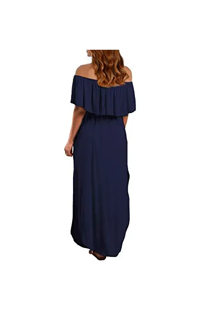 VERABENDI Women's Off Shoulder Summer Casual Long Ruffle Beach Maxi Dress with Pockets