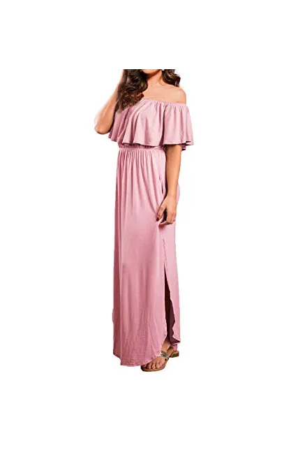 VERABENDI Women's Off Shoulder Summer Casual Long Ruffle Beach Maxi Dress with Pockets