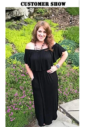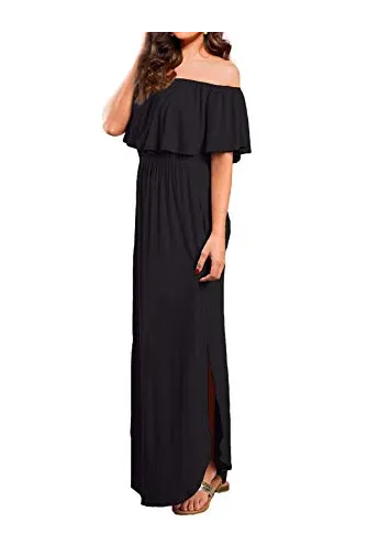 VERABENDI Women's Off Shoulder Summer Casual Long Ruffle Beach Maxi Dress with Pockets