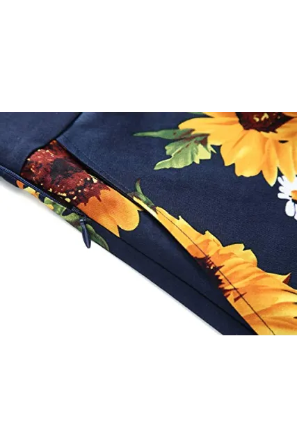 - Features sleeveless, round neck, floral skirt bottom, with two open pockets