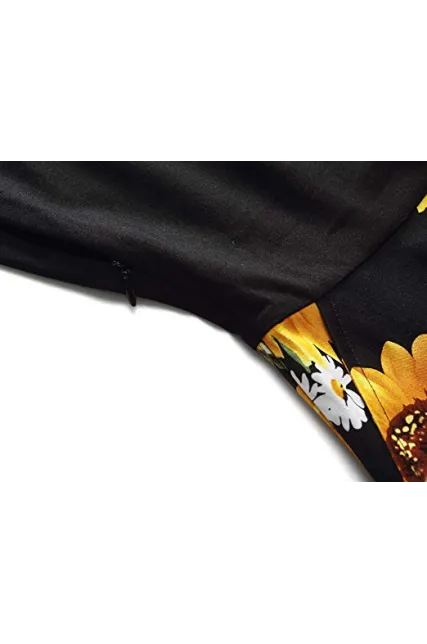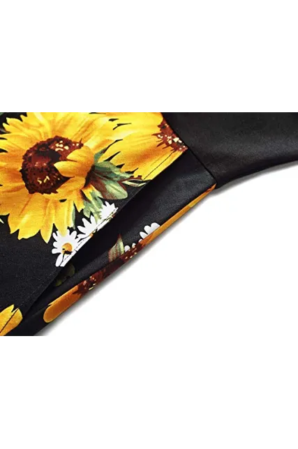 - Features sleeveless, round neck, floral skirt bottom, with two open pockets