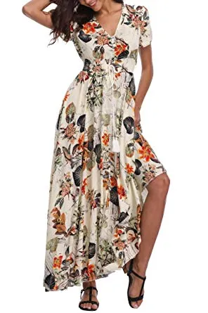 VintageClothing Women's Floral Maxi Dresses Boho Button Up Split Beach Party Dress
