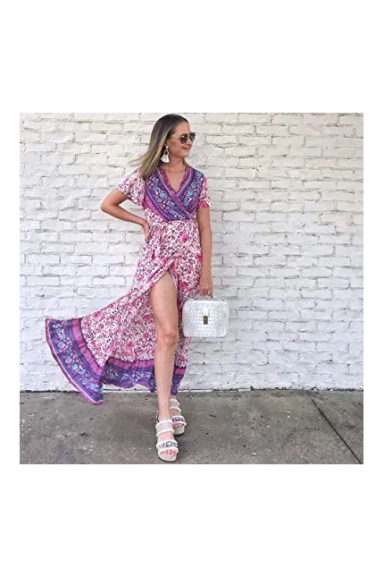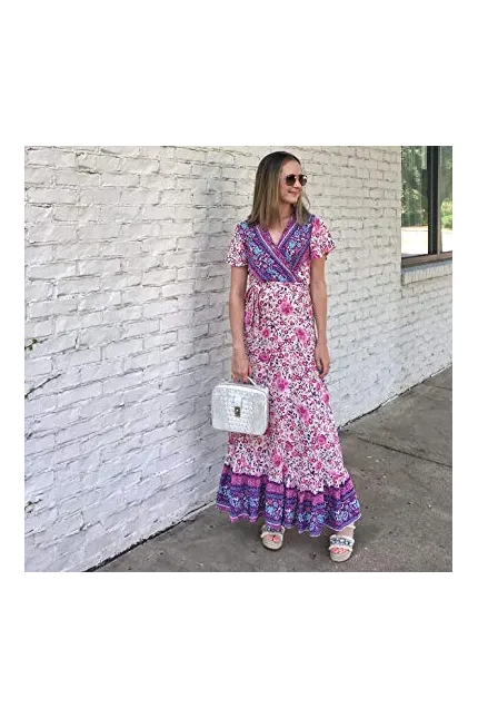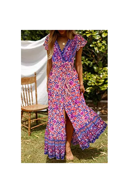 - This maxi features a wrap design, v-neckline,frill hemline and short butterfly sleeves making it an easy-to-wear statement piece; UNLINED.