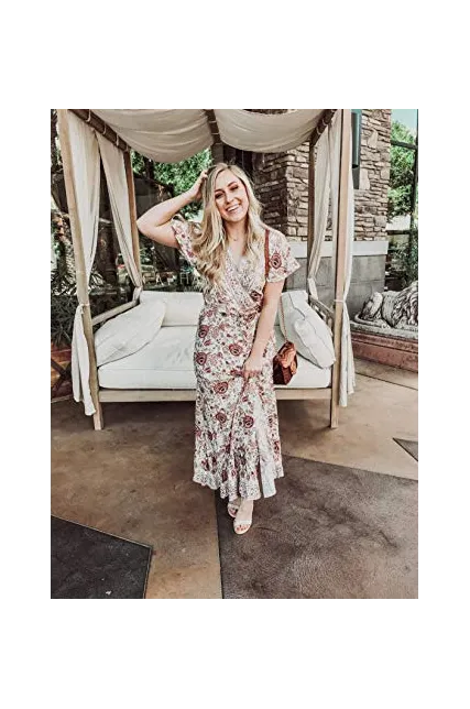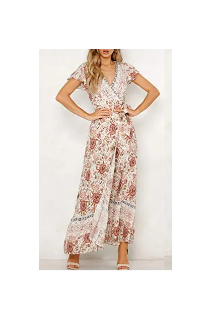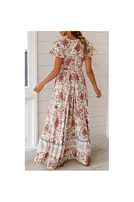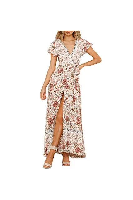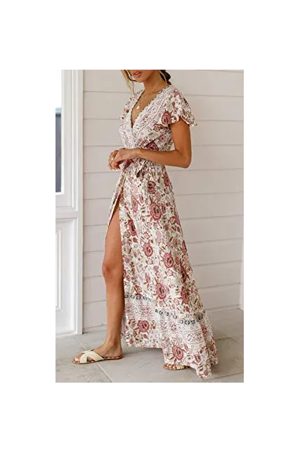 ZESICA Women's Bohemian Floral Printed Wrap V Neck Short Sleeve Split Beach Party Maxi Dress