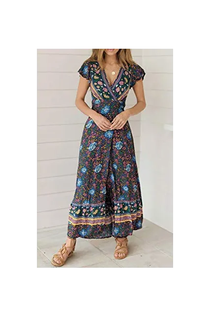 ZESICA Women's Bohemian Floral Printed Wrap V Neck Short Sleeve Split Beach Party Maxi Dress