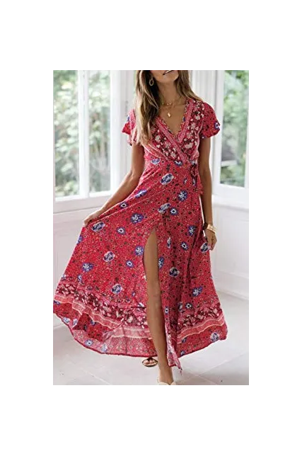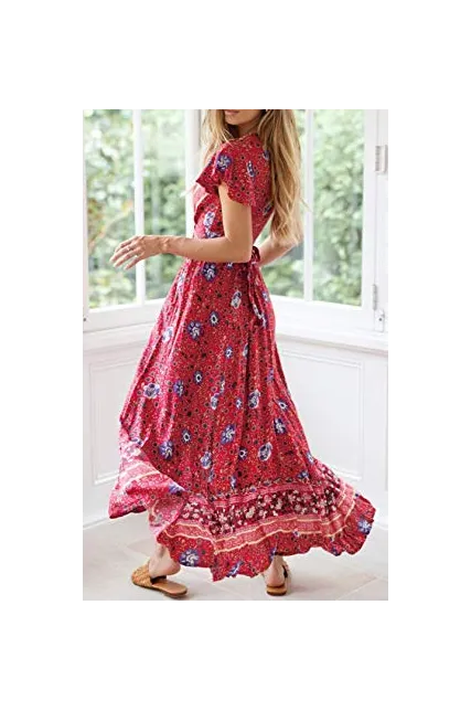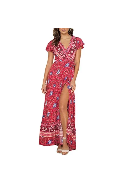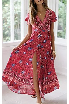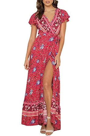 ZESICA Women's Bohemian Floral Printed Wrap V Neck Short Sleeve Split Beach Party Maxi Dress