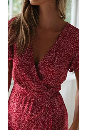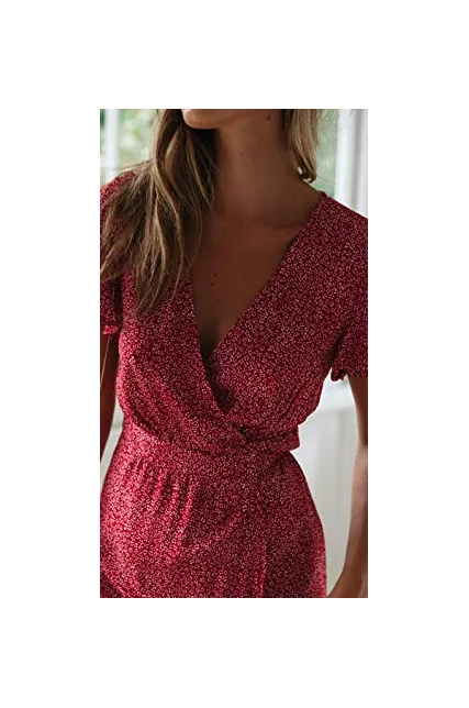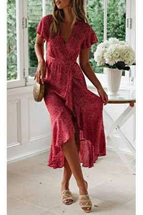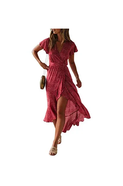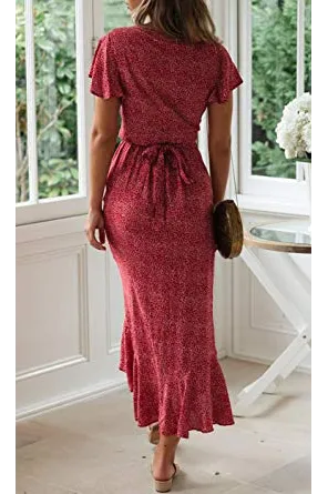 ZESICA Women's Bohemian Floral Printed Wrap V Neck Short Sleeve Split Beach Party Maxi Dress