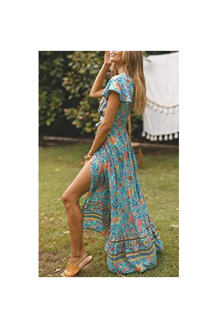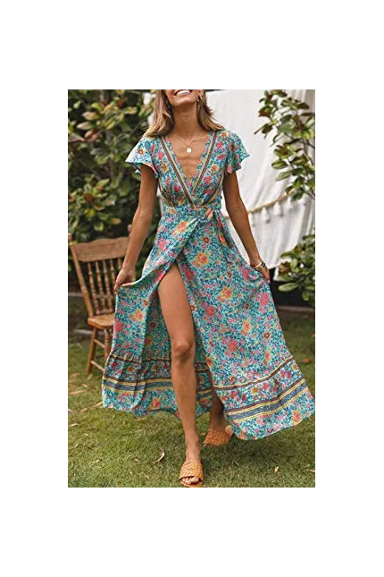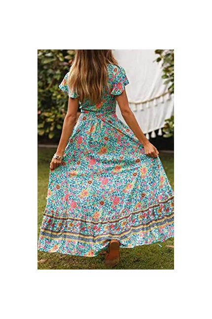 - This maxi features a wrap design, v-neckline,frill hemline and short butterfly sleeves making it an easy-to-wear statement piece; UNLINED.