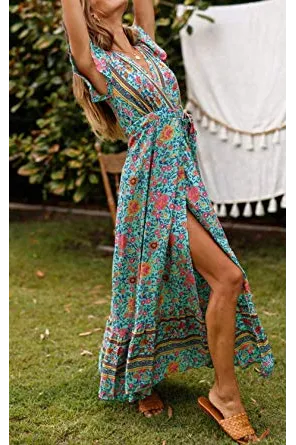 ZESICA Women's Bohemian Floral Printed Wrap V Neck Short Sleeve Split Beach Party Maxi Dress