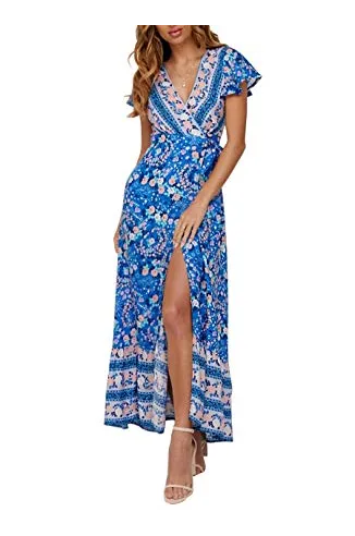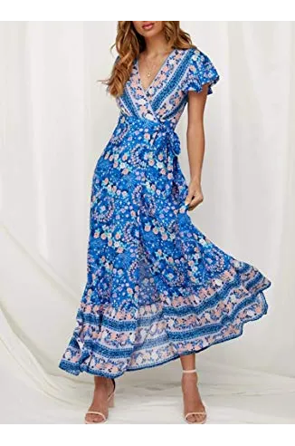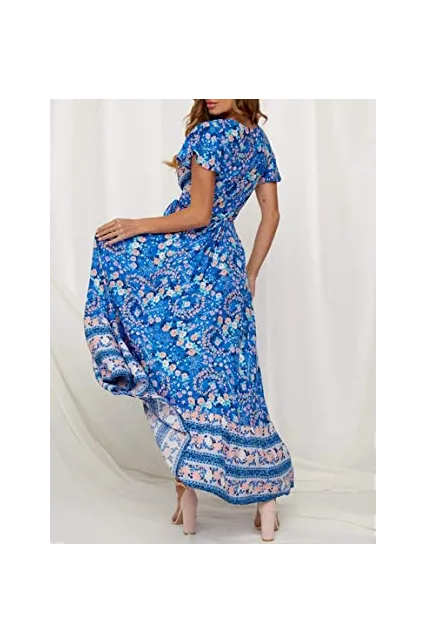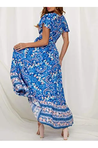 ZESICA Women's Bohemian Floral Printed Wrap V Neck Short Sleeve Split Beach Party Maxi Dress