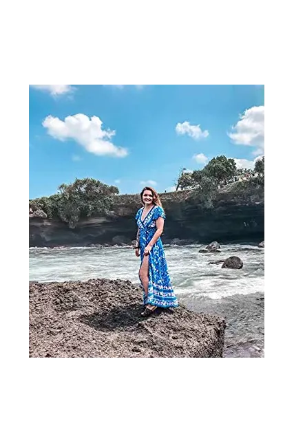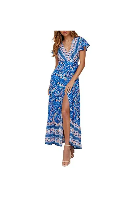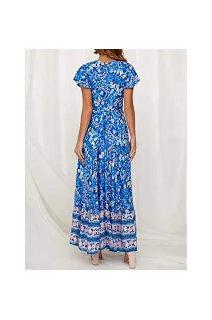 ZESICA Women's Bohemian Floral Printed Wrap V Neck Short Sleeve Split Beach Party Maxi Dress