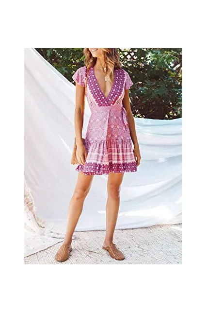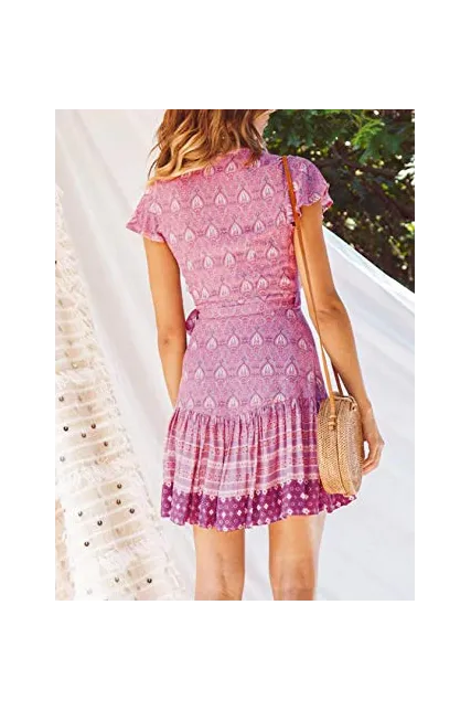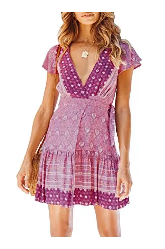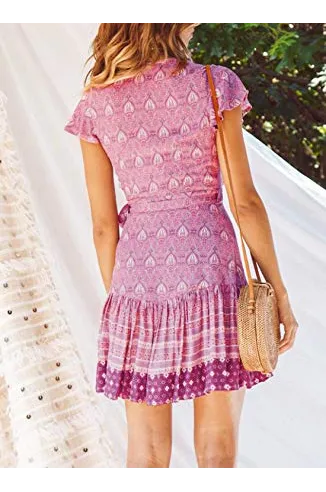 ZESICA Women’s Summer Wrap V Neck Bohemian Floral Print Ruffle Swing A Line Beach Mini Dress