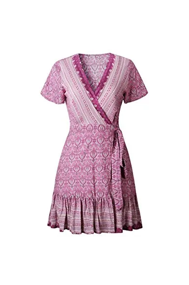 ZESICA Women’s Summer Wrap V Neck Bohemian Floral Print Ruffle Swing A Line Beach Mini Dress