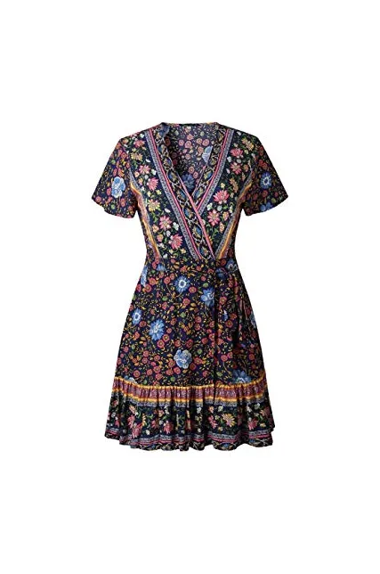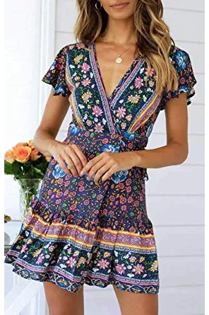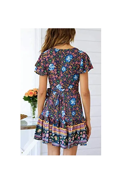ZESICA Women’s Summer Wrap V Neck Bohemian Floral Print Ruffle Swing A Line Beach Mini Dress