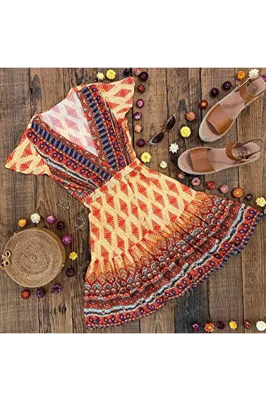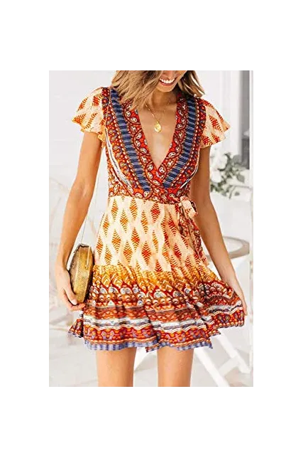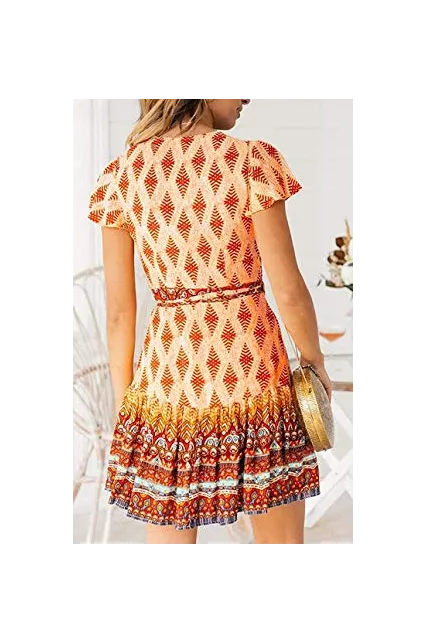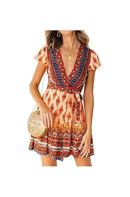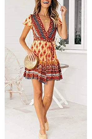 ZESICA Women’s Summer Wrap V Neck Bohemian Floral Print Ruffle Swing A Line Beach Mini Dress