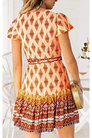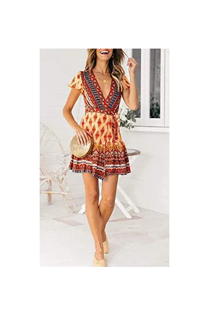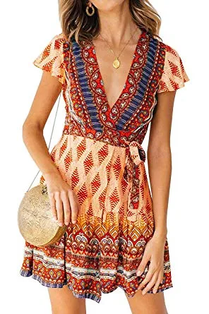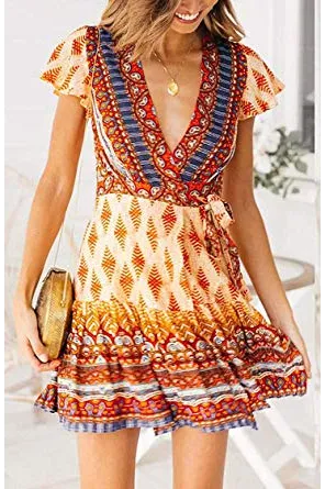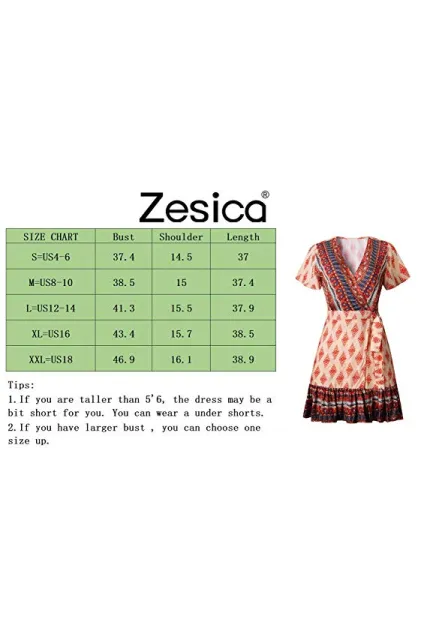 ZESICA Women’s Summer Wrap V Neck Bohemian Floral Print Ruffle Swing A Line Beach Mini Dress