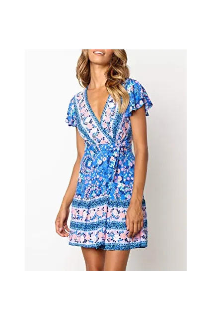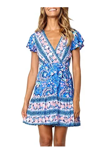 ZESICA Women’s Summer Wrap V Neck Bohemian Floral Print Ruffle Swing A Line Beach Mini Dress