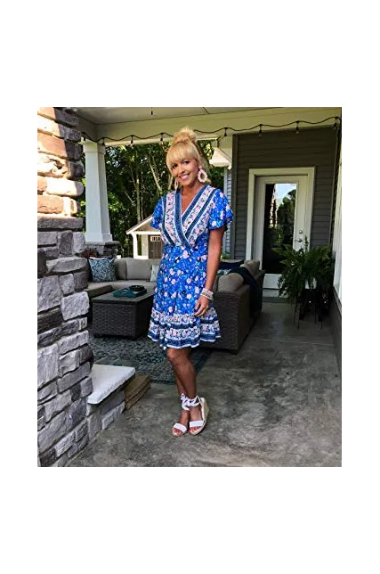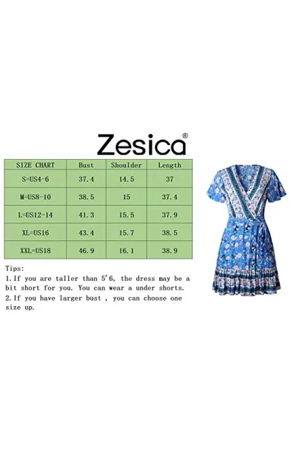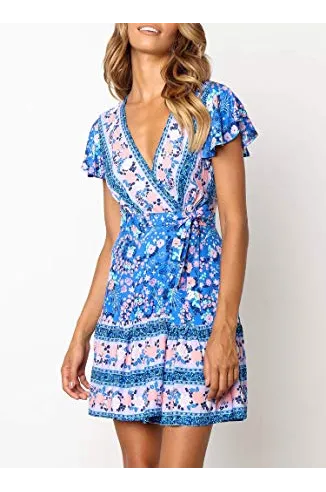 ZESICA Women’s Summer Wrap V Neck Bohemian Floral Print Ruffle Swing A Line Beach Mini Dress
