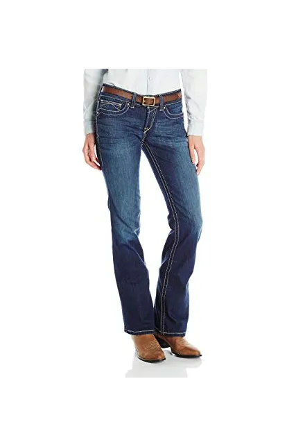 - Bootcut leg jean in hand-sanded finish featuring thick contrast stitching