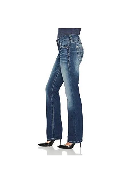 - Bootcut leg jean in hand-sanded finish featuring thick contrast stitching