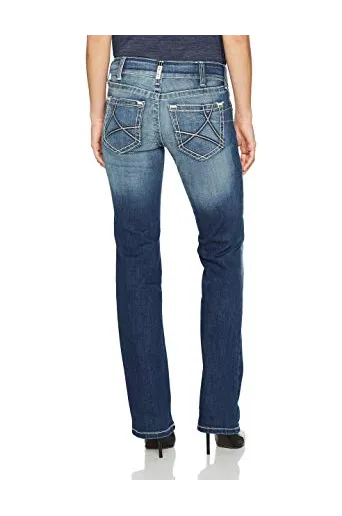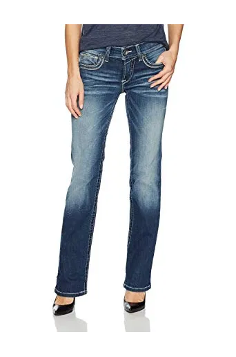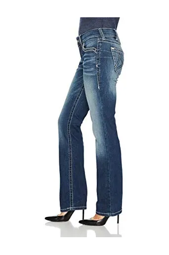 - Bootcut leg jean in hand-sanded finish featuring thick contrast stitching