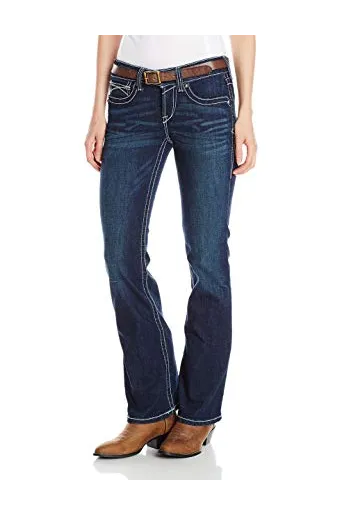 - Bootcut leg jean in hand-sanded finish featuring thick contrast stitching