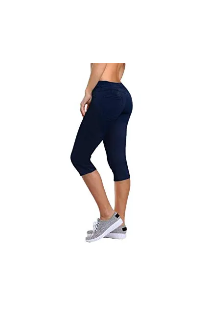 - Lift those assets with this stretchy capri pant that combines the look of denim with the comfort of your favorite yoga pants. Pair with your newest pair of sneakers to show off while on the go.