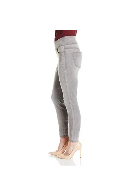 - Skinny jean featuring wide elastic waistband and five-pocket styling