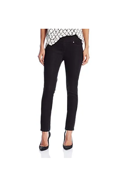 - Skinny jean featuring wide elastic waistband and five-pocket styling