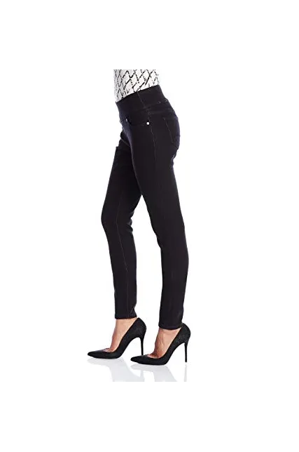 - Skinny jean featuring wide elastic waistband and five-pocket styling
